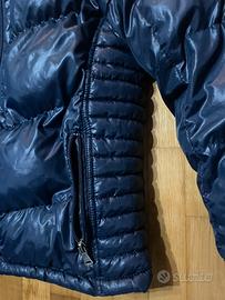 Si tratta di un giubbotto imbottito di colore blu scuro, dal design sportivo e invernale. È realizzato in tessuto lucido, con trapuntatura orizzontale che dona volume e aiuta a trattenere il calore.