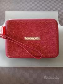 Nécessaire glitterata amaranth Havaianas Pochette in silicone, flessibile e lavabile, misura grande, colore bordoux/amaranto, con glitter. Le misure sono nelle foto Ideale per la spiaggia, la piscina o il tempo libero. Chiusura: zip con tiralampo in gomma brandizzato Dimensioni: circa 23 x 17x4,5 cm (può contenere cellulare, documenti, make-up, chiavi) Cintino da polso incluso, per portarla comodamente