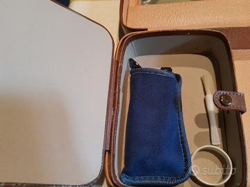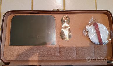 Articolo in pelle, metallo e vetro (portaspazzolino e portasapone); mai usato; parte superiore, calzascarpe e specchio che presenta una macchietta per vetustà; parte inferiore: a sin una scatolina fissa, la parte di dx è asportabile; le saponette, gli occhiali blu e la bottiglietta vuota non sono in vendita, sono stati messi come esempi di utilizzo. Articolo da collezionismo. Misure cm. 31x15x6