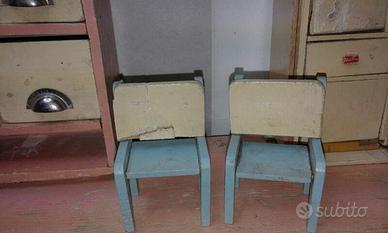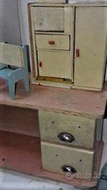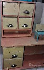 Vecchio giocattolo in legno d'epoca . anni 40/50 , in condizioni come da foto . così trovato . è stato solo pulito dalla polvere . rappresenta un banco di negozio , forse da drogheria , con 2 sedie . alcune parti sono incollate . ho preferito non manomettere per conservare l'originalità . tutto in legno ad eccezione delle maniglie che sono in metallo . misura circa 40 cm per 40 cm circa di altezza . bellissimo , rarissimo , introvabile . dietro c'è un tagliando d'acquisto con numeri di serie acquistato presso LA RINASCENTE . no tarli .
