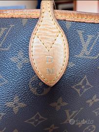 Borsa Nerverfull MM con fattura d'acquisto a prova dell'autenticità, dustbag e borsa in carta, tutto autentico. La borsa è stata utilizzata ma è stata tenuta con cura, i manici, i tiranti laterali e la parte esterna sono in ottime condizioni. Come si vede presenta i segni di usura (visibili nelle fotografie): interno non immacolato, consumo del profilo in vacchetta su profilo in alto, due segni alla base; l'interno della bustina con cerniera è screpolato come succede a tutte le borse di questo modello. Personalizzata con le lettere DM, si possono sostituire manici con personalizzazione e bordino in vacchetta portandola in un qualsiasi negozio Louis Vuitton e rendendola simile al nuovo. Costo attuale in negozio 1550 euro.