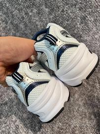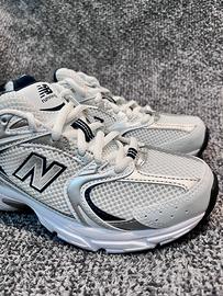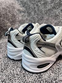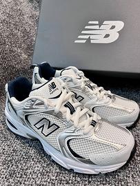 The New Balance 530 White Silver Navy features a white mesh upper with metallic silver and white leather overlays. On the quarter panel, a grey New Balance logo outlined in navy adds contrast. From there, a white and grey ABZORB sole adds the finishing touch.