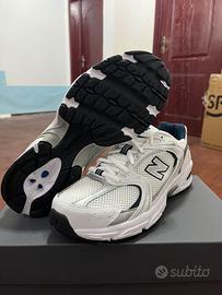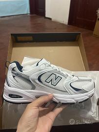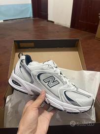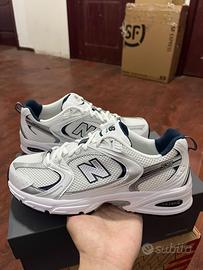 The New Balance 530 White Silver Navy features a white mesh upper with metallic silver and white leather overlays. On the quarter panel, a grey New Balance logo outlined in navy adds contrast. From there, a white and grey ABZORB sole adds the finishing touch.