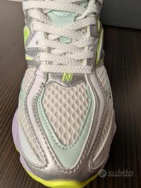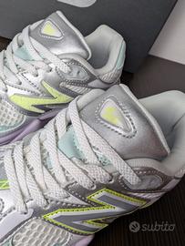 Colorazione particolare con dettagli verde fluo e suola lilla.
