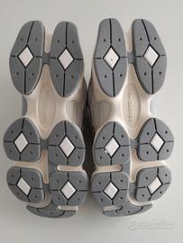 Caratterizzata da tonalità neutre di grigio e bianco sporco, con una tomaia che combina mesh traspirante e sovrapposizioni in pregiato suede