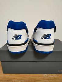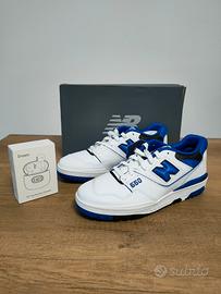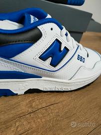 Questa è una sneaker New Balance 550 bianca e blu, originariamente una scarpa da basket del 1989, riportata in auge come icona di stile streetwear.