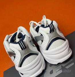 Le scarpe da running traspiranti New Balance NB530, che rifuggono la popolare silhouette in pelle del passato, offrono un look decisamente retrò. Progettate con una semplice e rinfrescante base bianca pura, le scarpe presentano un'ampia struttura in tessuto a rete, impreziosita da una placcatura argentata riflettente a contrasto sulla punta, sugli occhielli per i lacci e su altri dettagli. Il caratteristico logo "N" e il logo del marchio impreziosiscono la linguetta e i pannelli laterali. Nuove di zecca e con scatola inclusa.