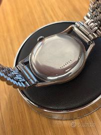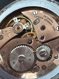 Splendido Nicolet Watch vintage, meccanico a carica manuale, 17 rubini, Swiss Made. 🔎 Descrizione Orologio dal grande fascino anni ’40/’50 con caratteristiche davvero particolari: •Cassa da 37 mm (misura importante per l’epoca, molto portabile anche oggi) •Movimento meccanico 17 jewels – Swiss Made •Fondello in acciaio marchiato “Zenith” •Vetro da sostituire (presenta segni evidenti), ma non pregiudica il funzionamento •Bracciale in acciaio •Piccoli segni del tempo coerenti con l’età ✨ Il quadrante Il vero protagonista è il quadrante: •Texture guilloché/micro martellata molto rara •Indici triangolari applicati in rilievo •Numeri arabi 12, 3 e 9 con patina naturale •Piccoli secondi a ore 6 con lavorazione circolare •Patina uniforme e autentica, che dona carattere e calore Un quadrante estremamente elegante e non comune, che rende questo esemplare diverso dai classici dress watch dell’epoca. ⸻ 🏛 Cenni storici sul marchio Nicolet Il nome Nicolet è legato alla tradizione orologiera svizzera del Giura, area storicamente centrale per la produzione di movimenti meccanici. Molti marchi minori del dopoguerra producevano orologi con movimenti svizzeri di qualità , spesso forniti da manifatture terze, proponendo: •Ottimi calibri manuali 15/17 rubini •Design ricercati •Produzioni in numeri contenuti
