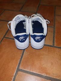 Vendo scarpe Nike Air Force 1 originali, colore bianco con dettagli blu navy, taglia italiana 38.5. Le scarpe sono state usate pochissimo e sono in ottime condizioni, come si può vedere dalle foto: suola pulita, tomaia ben tenuta e lacci originali leggermente rovinati sulle punte.