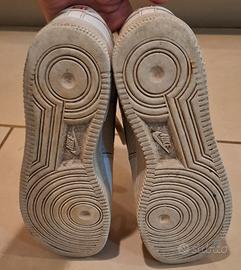 Nike Air Force 1 originali. Scarpe molto usate, con segni evidenti di utilizzo: usura interna sul tallone e segni su tomaia e suola (vedi foto). Ancora utilizzabili come scarpe da tutti i giorni o da lavoro. Prezzo basso per lo stato.