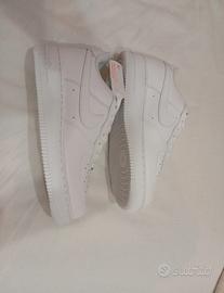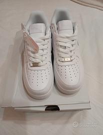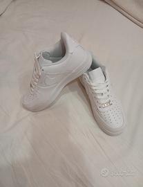 Vendo iconiche sneakers Nike Air Force 1 Low in bianco.