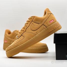 Drawing inspiration from classic work boots, the Nike Air Force 1 Low SP Supreme Wheat features a Flax Durabuck upper with Supreme Box Logo insignias on the lateral heels. At the base, a matching Flax Air sole completes the design.