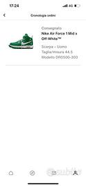 Vendesi Nike Air Force 1 Mid x Off-White Pine Green verde/bianco ancora SIGILLATE nella scatola originale da spedizione Nike(valore aggiunto )fuori produzione .Acquistate su SNKRS .Le apro per visione SOLO su richiesta e solo all’acquirente che le acquisterà. Grazie Max Ps:prima foto di repertorio