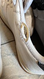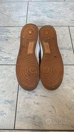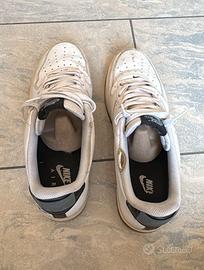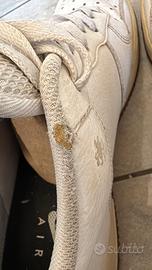 Scarpe Nike CT2298-100 bianche con placchetta metallica dorata nel logo laterale delle scarpe. Ha due buchi nella parte superiore visibili in foto, per il resto ottime condizioni. Taglia US 10,5 UK 9,5 EUR 44,5 cm 28,5 BR 42,5 CN 285 (2,5). Made in Vietnam. Disponibile a consegna a mano a Roma.