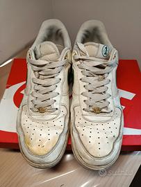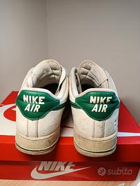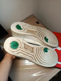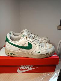 Nike Air Force 1 '07 LV8 "40th Anniversary iconiche Nike Air Force 1 Low nella ricercata colorazione Sail/Malachite, parte della collezione esclusiva rilasciata per celebrare il 40esimo anniversario dello storico modello AF1. Dettagli che rendono unico questo modello: Colori: Base color vela (bianco panna) con Swoosh e dettagli verde malachite. Inserti Gold: Occhielli superiori e targhetta dei lacci (dubrae) in metallo dorato. Branding celebrativo: Numero "40" impresso lateralmente sul tallone e logo speciale sulla linguetta. Stile: Look vintage e materiali di alta qualità Condizioni: usate moltissimo, soprattutto il palestra. Presenta molti buchi mostrati nelle ultime foto