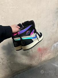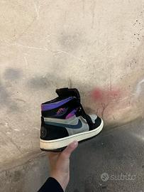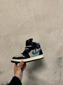 Vendo Nike Air Jordan 1 High PSG (Paris Saint-Germain) originali, colorazione nero/grigio con dettagli viola e swoosh azzurro.