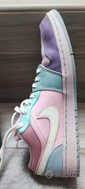 L'Air Jordan 1 LowEaster Pastel, soprannominata anche"Multi Pastel", è decorata con un vivace mosaico di calde colorazioni estive. Iniziando dalla parte superiore della scarpa troviamo un logo Jumpman giallo luminescente, che si abbina al colore dei lacci e dello Swoosh sempre protagonista. A completare questi dettagli c'è una linguetta rosa, pareti laterali verde acqua, un tallone azzurro e una punta color lavanda. Una sottile etichetta "AIR JORDAN" è stampata sul tallone come tocco finale al design della tomaia in pelle.