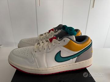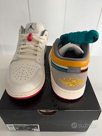 Nike Air Jordan 1 Low Premium (ref. HV4511 133), colore Sail/Cashmere/College Grey/Brave Blue. Taglia 43 (US 9.5), nuove e originali. Mai indossate. Acquistate su App Nike SNKRS ufficiale. Disponibile fattura. Modello con una particolarità da intenditori: coulisse rossa “Jumpman” sui lacci come presente nelle leggendarie Air Jordan 6 Retro Infrared Black del 1991. Da notare i colori contrastanti degli swoosh, tocco di stile e originalità. Preferisco scambio a mano su Milano/Varese e provincia, possibilità di spedizione. Descrizione prodotto: Le Jordan 1 Low PRM in cashmere e avorio hanno l'iconica silhouette Air Jordan 1 Low con una colorway neutra avorio e cashmere con accenti in blu, gialli e grigio. Originariamente progettate come scarpa da basket basse, questa versione delle AJ 1 low sfoggiano una struttura in pelle premium con la base, le sovrapposizioni e gli occhielli tutti realizzati con lo stesso materiale. Queste sneakers low-top, con capsule AIR nella suola, vantano anche un altro elemento degno di nota: i lucchetti in plastica attaccati ai lacci. Presi in prestito dalle Air Jordan 5 e 6, questi elementi assicurano la vestibilità e aggiungono un tocco di rosso che si abbina alla suola in gomma. Stupendi i colori contrastanti degli swoosh: la scarpa sinistra sfoggia uno swoosh verde foglia di tè e nero, mentre la scarpa destra ha uno swoosh bianco e blu.