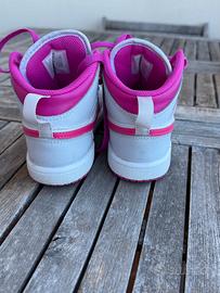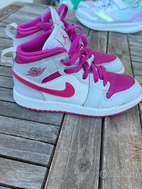 Vendo sneakers Nike Air Jordan 1 Mid da bambina, colore bianco/fucsia, acquistate a settembre 2024.
