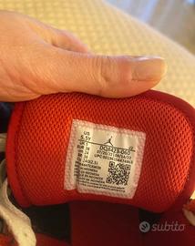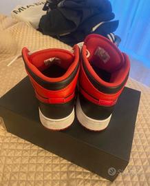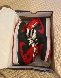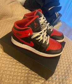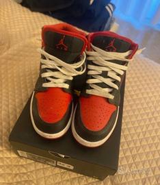 Nike Air Jordan 1 Mid. Taglia 38. Colore rosso e nero. Lacci bianchi. Sono state utilizzate 3 giorni e rimesse nel cartone. Sono come nuove.