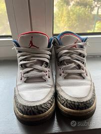 Vendo paio di Air Jordan 3 Retro originali, colore bianco con dettagli rossi e blu e classico motivo elephant print grigio/nero.
