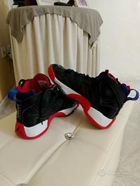 La scarpa nell'immagine è la Jordan Jumpman Two Trey, un modello ibrido che rende omaggio alla carriera di Michael Jordan a Chicago e combina elementi di diversi modelli storici di Air Jordan.Questa specifica variante è spesso indicata come "Bred" o "Raptors", caratterizzata da una base nera con accenti in "True Red" (rosso) e "Dark Concord"(viola)