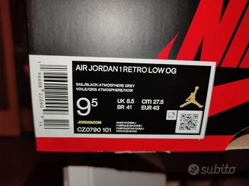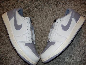 Vendo Nike Air Jordan Low 1 grigio atmosfera, nuove mai indossate, con doppie stringhe bianche, e grigie, scatola originale nike, taglia 9,5