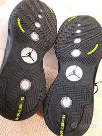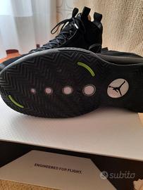 Nike Air Jordan XXXIV (34) scarpe da basket col. total black con inserti glitter e verde lime, ottime sia per il gioco sia per l'uso quotidiano, indossate 2 volte e poi mai più utilizzate per fine attività sportiva. Sono anche considerate sneakers trendy da collezione.
