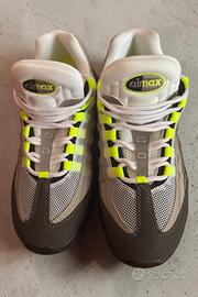 Scarpe da ginnastica Nike Air Max 95 in ottime condizioni, con dettagli in giallo neon e grigio. ⭐️ Condizione: 9/10 🎨 Colore: Grigio e giallo