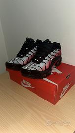 Vendo Nike Air Max Plus (GS) originali, nuove e mai indossate. Modello iconico con bellissima sfumatura dal bianco al rosso e dettagli neri.
