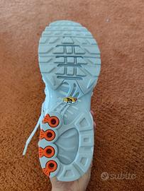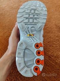 Vendo scarpe Nike Air Max Plus Utility nuove, mai indossate. Numero 41. Le scarpe sono bianche con dettagli arancioni e grigi.