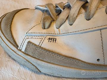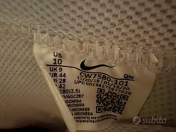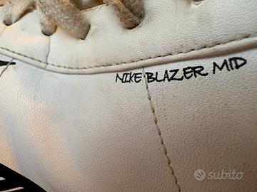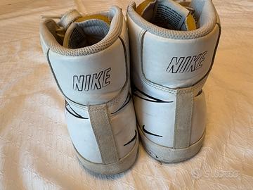 Modello: Nike Blazer Mid '77 Sketch • Taglia: 44 EU / 10 US / 9 UK / 28 cm • Colore: Bianco con dettagli neri e inserti in pelle scamosciata grigia sulla punta. • Condizioni: Usate, come visibile in foto. La suola presenta la normale usura da utilizzo, ma la tomaia in pelle è ancora solida e ben tenuta. Lacci originali inclusi.