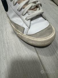 Vendo iconiche Nike Blazer Mid '77 Vintage nella classica colorazione bianca con baffo (Swoosh) nero. Un modello intramontabile che sta bene su tutto, dai jeans ai pantaloni più eleganti.