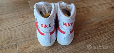 Vendo scarpe Nike modello stile Blazer Mid, colore bianco con Swoosh rosso e scritta NIKE sul retro.