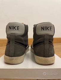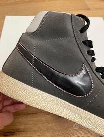 Nike Blazer Midi scamosciate colore grigio con swoosh nero lucido con cuciture fucsia, stringhe nere e suola fucsia.