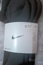 Confezione originale da 3 paia di calzini Nike Dri-FIT neri, taglia M (EUR 38–42 / US 6–8 / UK 5–8). Design sportivo con logo Nike ricamato in bianco sulla caviglia. Realizzati con tecnologia Dri-FIT per mantenere i piedi asciutti e comodi durante l’attività fisica. Ideali per sport, tempo libero o uso quotidiano.