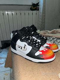 Nike Dunk High Personalizzate – Custom Design Unico Vendo paio di Nike Dunk High personalizzate con design unico e accattivante. Le scarpe presentano una base in bianco e nero, arricchita da una spettacolare fiamma sfumata in rosso, arancione e giallo sulla punta, che dona un look audace e originale. Lo Swoosh Nike è stato customizzato con una stampa Dior, per un tocco di lusso e stile streetwear.