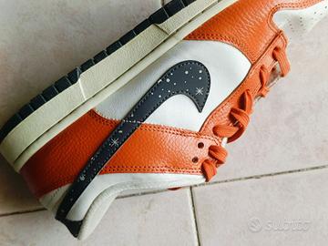 Colorway ricercata con dettagli grafici ispirati al cielo notturno, swoosh e tallone decorati, combinazione arancione / bianco ad alto impatto visivo.
