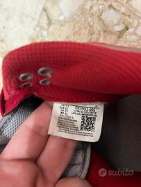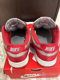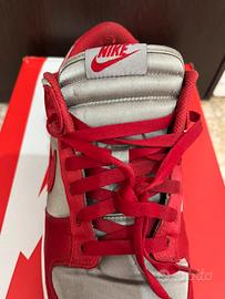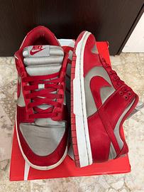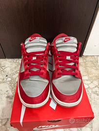 Sneakers Nike Dunk Low in Raso per donna (taglia 42), utilizzabile anche da uomo. Ottime condizioni, lacci originali e colorazione particolare (rosso e grigio), perfetta per outfit estivi e sportivi. Presenta lo Swoosh e vari inserti in grigio, mentre la suola bianca con battistrada rosso.