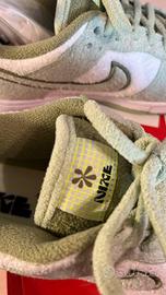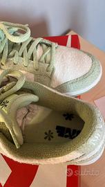 Nike dunk Low SE Fleece Green presentano un materiale in pile che ricopre l’intera tomaia. Le parti bianche sono abbinate a inserti verde melone e ai lacci sulla linguetta.