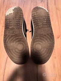 Vendo sneakers stile Air Jordan 1 Low Travis Scott colore marrone/nero con Swoosh laterale bianco, suola classica Jordan e branding Nike Air sulla linguetta. Le scarpe sono usate, con segni di usura su suola, tomaia e interno tallone ma ancora comode e senza rotture strutturali evidenti, ideali per chi vuole lo stile Travis Scott a prezzo basso.