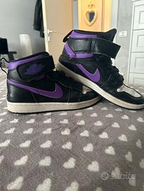 Vendo scarpe Nike Jordan da uomo misura 41 usate pochissimo e in buone condizioni. Il colore è bianco, nero e viola.