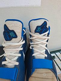 Scarpe da basket Nike KD Trey 5 VIII, ispirate al campione NBA Kevin Durant. Colore blu con dettagli beige e suola in gomma chiara. Logo Nike bianco sul lato e linguetta con scritta "KD".
