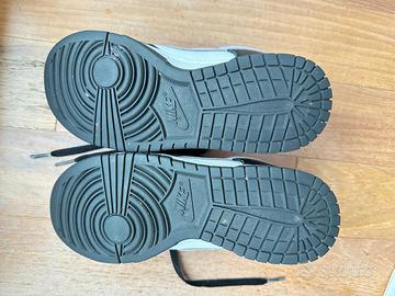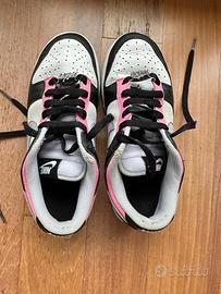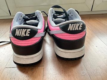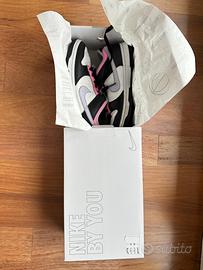 Nike low by you. Modello dunk personalizzato nei colori nero, lilla e rosa. Piccoli segni di usura nella parte alta della tomaia e qualche piega tipica della scarpa che sparisce indossandole.
