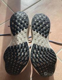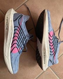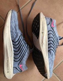 Scarpa da corsa unisex molto leggera, realizzata con materiale riciclato, indossate solo due volte in palestra per un paio d'ore. Praticamente nuove senza segni di usura, suola e tomaia perfette. N. 40 ma vestono un po' stretto (più adatte a 39,5/39). Con scatola originale. Color grigio azzurro con simbolo Nike rosa e righe nere.