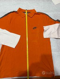 Polo casual firmata Nike, dal design unico con maniche lunghe bianche sovrapposte al corpo arancione e dettagli grigi sulle spalle.
