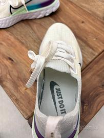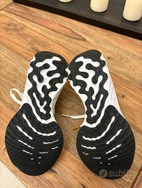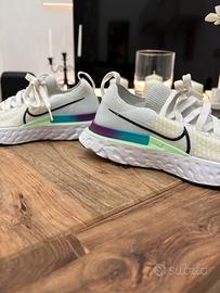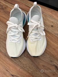 Nike React Infinity Run Flyknit, taglia 36 (EU), letteralmente nuove — mai indossate, nessun segno di utilizzo. Modello da running pensato per ridurre gli infortuni, con tomaia in Flyknit ultra-traspirante color bianco/panna e dettaglio tallone iridescente sfumato viola, azzurro e verde menta. Suola in schiuma React larga e ammortizzata, outsole in gomma nera. ✅ Condizioni: 10/10 — nuove, mai messe ai piedi ✅ Taglia: 36 EU ✅ Colore: Bianco / Iridescente ✅ Spedizione tracciata disponibile