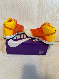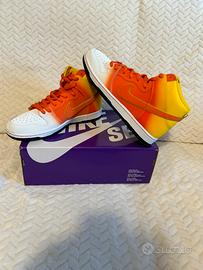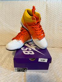 La Nike SB Dunk High Sweet Tooth Candy Corn presenta una tomaia tricolore, realizzata in modo creativo per riprodurre i segni dei denti sulla punta. Sul tallone laterale è rappresentato un molare con pezzi di caramella, così come nell'etichetta interna della linguetta, che riporta anche un messaggio di avvertimento: "non accettare caramelle dagli sconosciuti". A completare il design della sneaker ci sono delle solette con la rappresentazione di caramelle