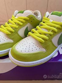Nike SB Dunk Low Green Apple features an off-white tumbled leather upper with suede candy apple green overlays and Swooshes. On the inside face of the tongue, a woven label depicting a cartoon-style apple character adds a playful look to the silhouette.