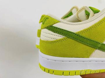 Nike SB Dunk Low Green Apple features an off-white tumbled leather upper with suede candy apple green overlays and Swooshes. On the inside face of the tongue, a woven label depicting a cartoon-style apple character adds a playful look to the silhouette.